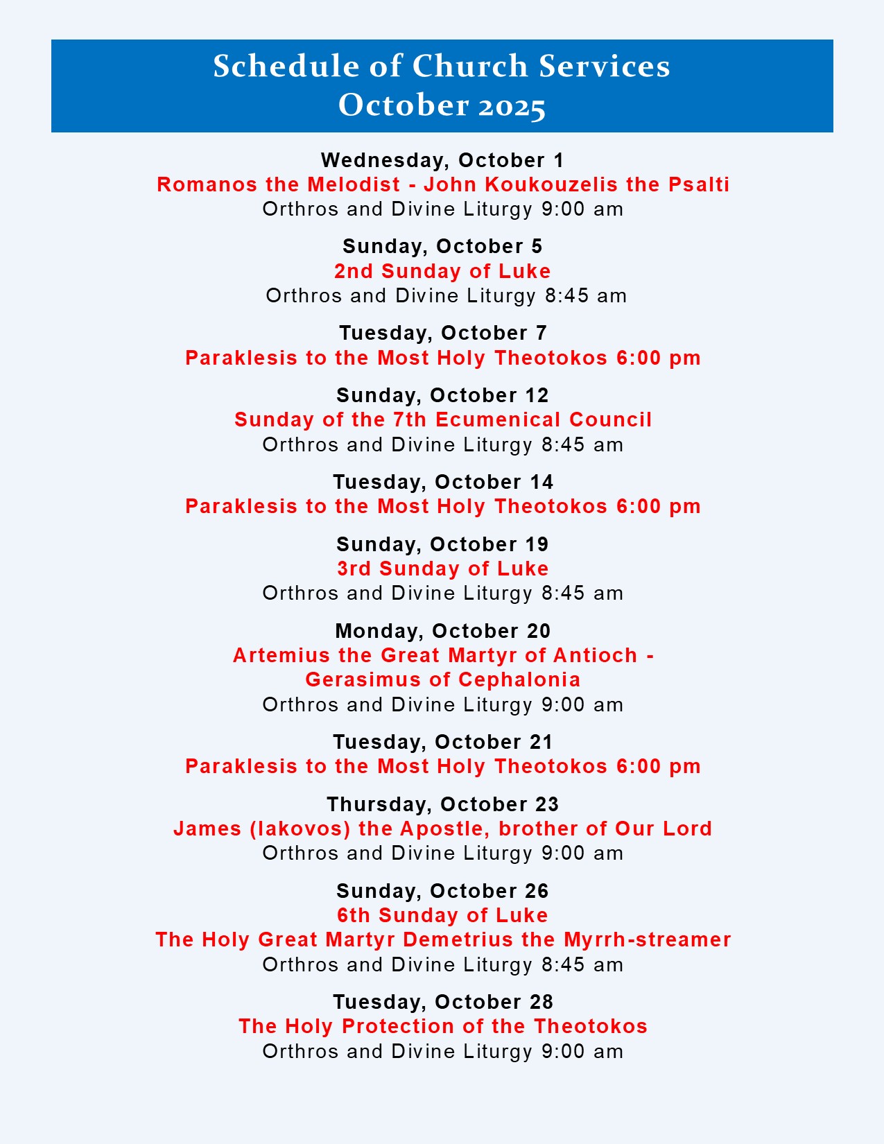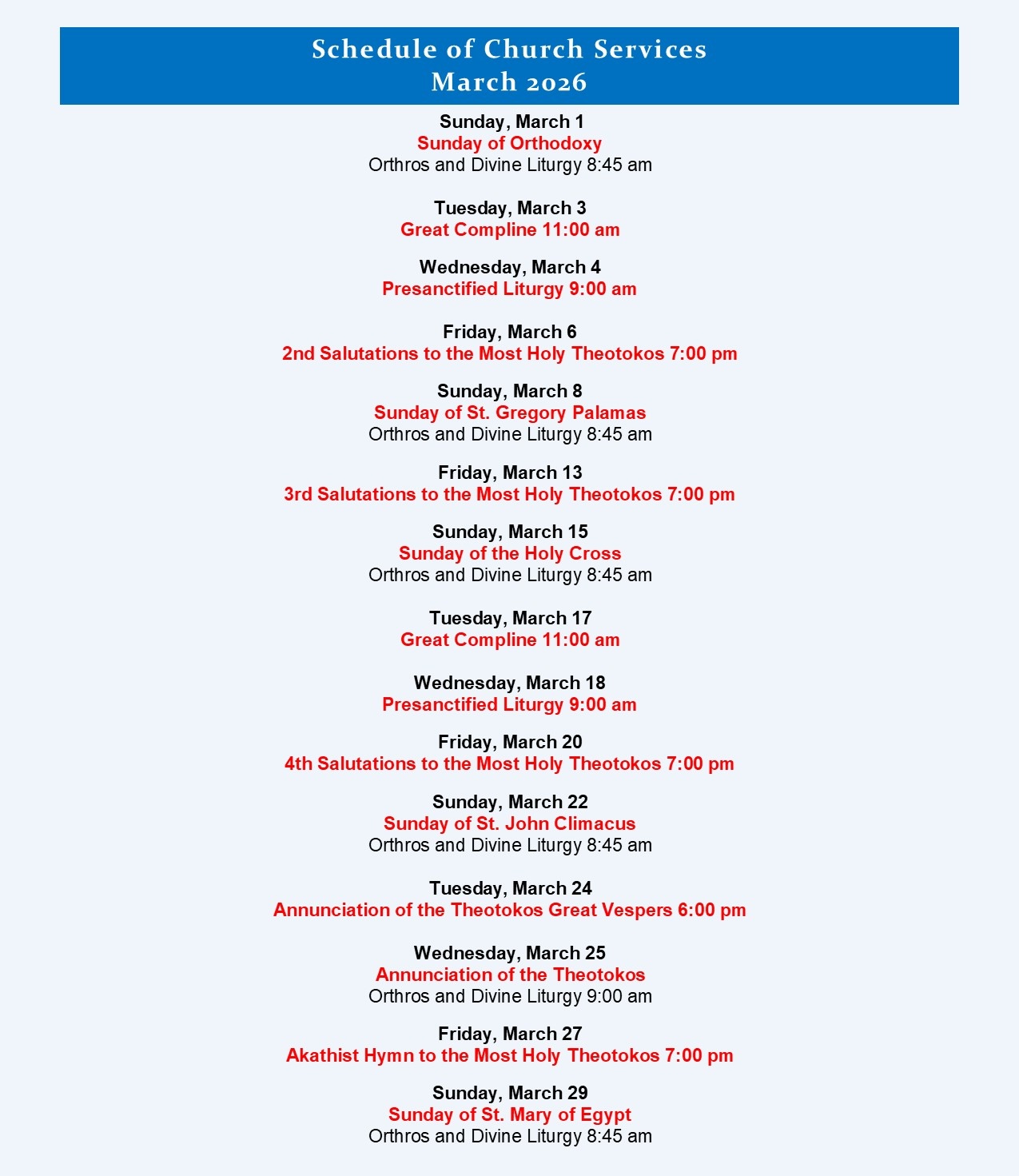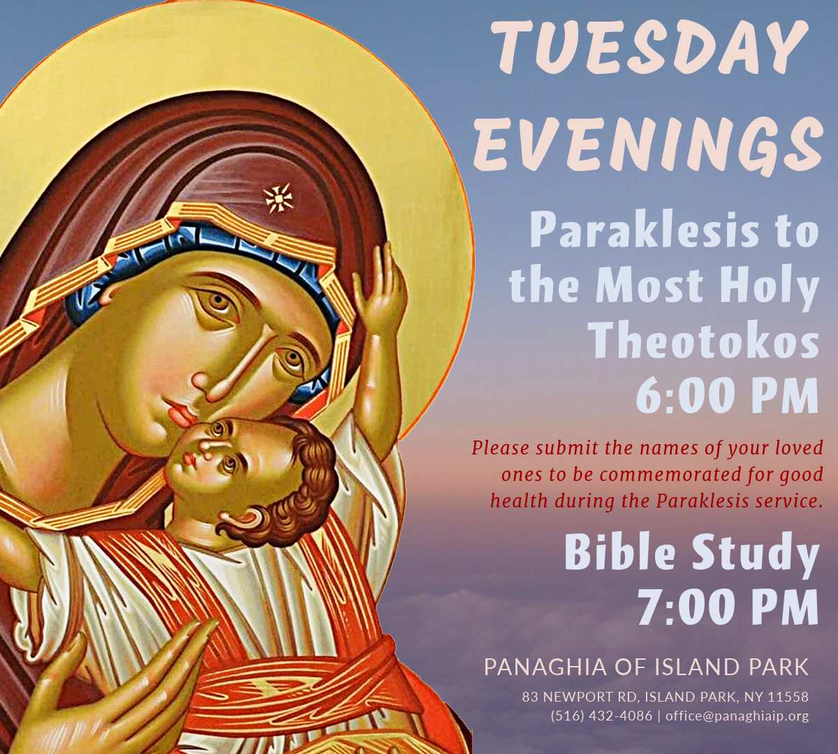 I extend an invitation to you and your families to join us in worship and I look forward to welcoming you to our parish in person. I pray that through the blessings of our Panaghia, you will feel a sense of peace, comfort, and at home in Panaghia's home of Island Park, as we worship together as a spiritual family.